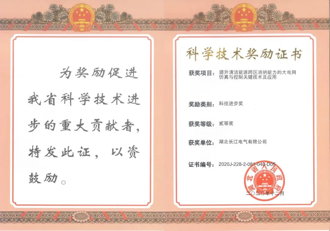 2月18日,湖北省科技创新大会隆重举行,长江电气凭借“提升清洁能源跨区消纳能力的大电网仿真与控制关键技术及应用”项目,荣获湖北科学技术进步二等奖。这也是继2019年荣获湖北科技进步一等奖之后,长江电气收获的又一项湖北科学技术进步奖。