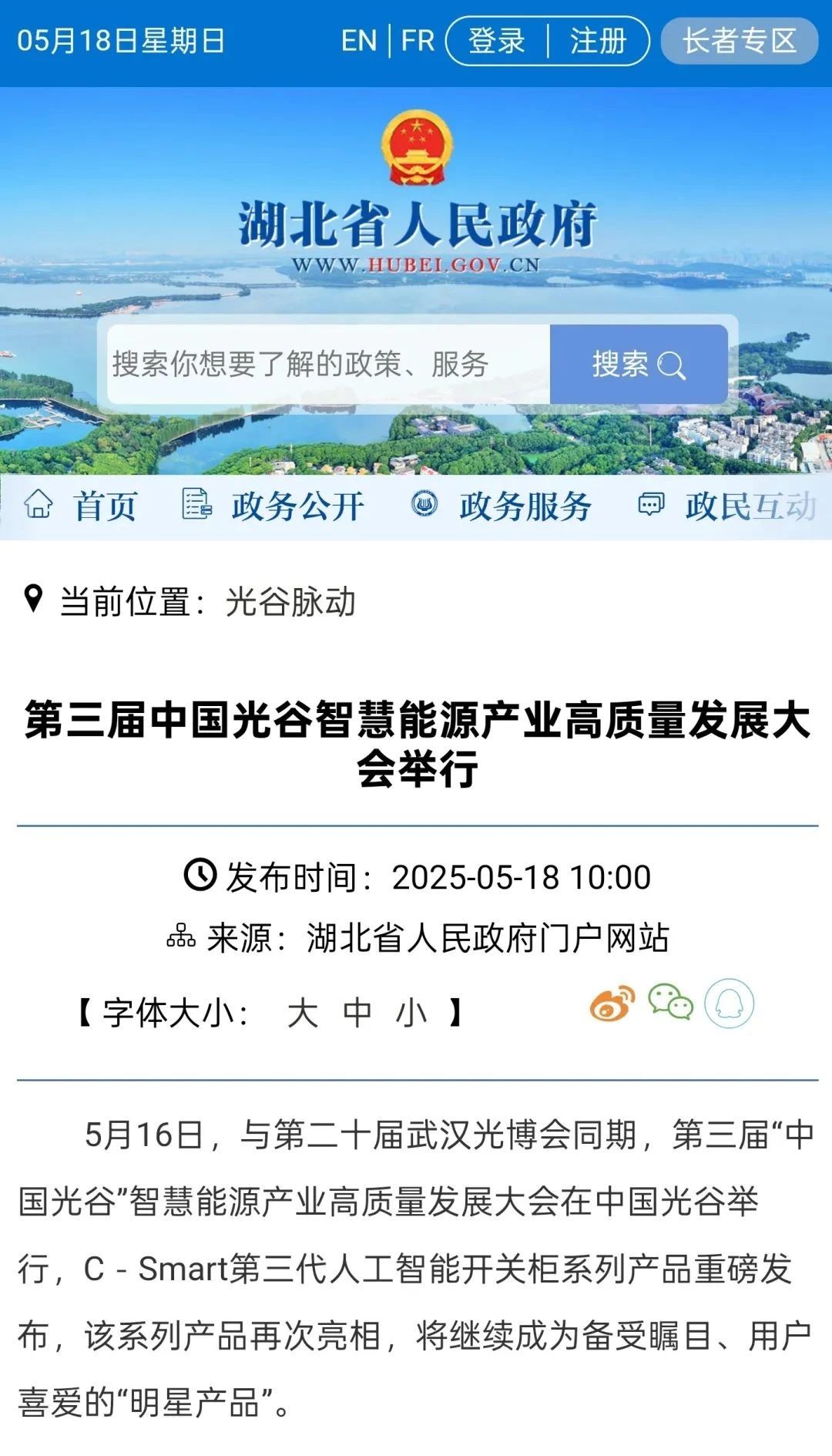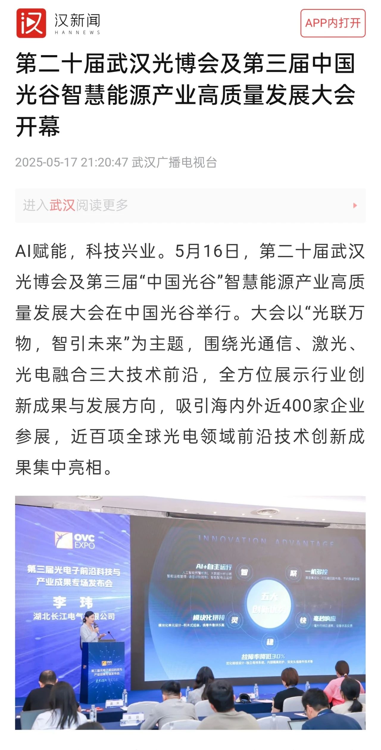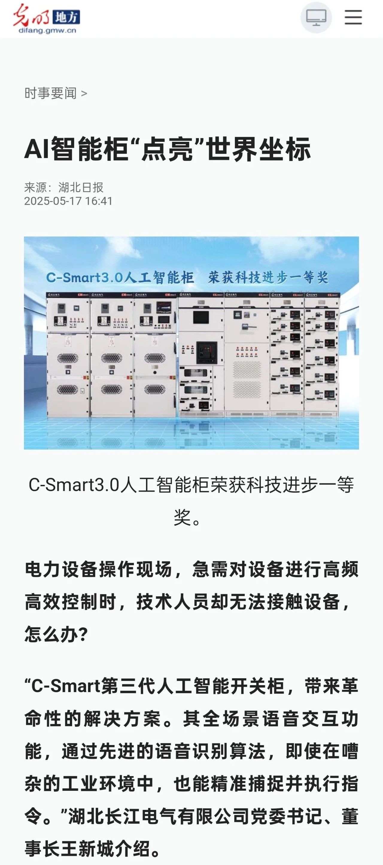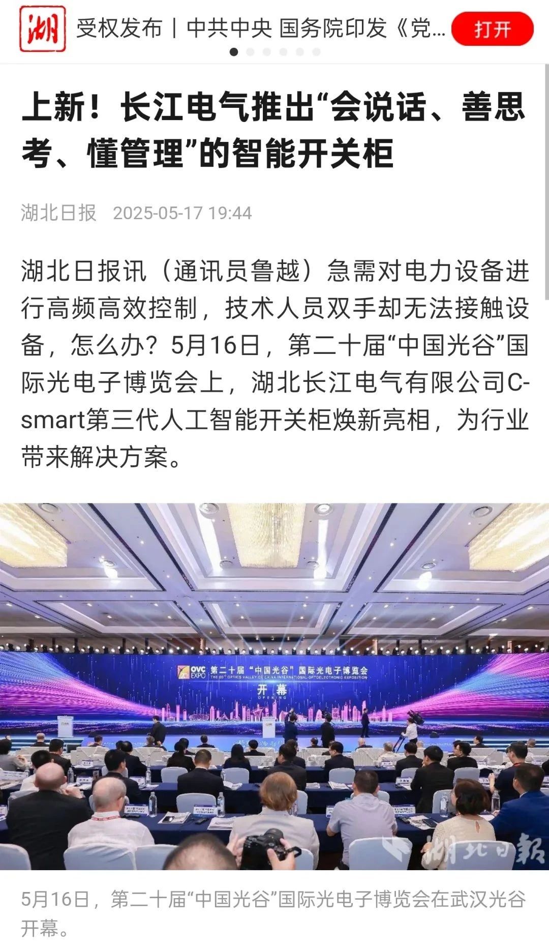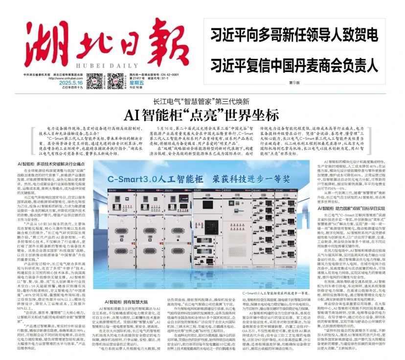5月16日,第二十届武汉光博会及第三届“中国光谷”智慧能源产业高质量发展大会在中国光谷隆重举行,C-Smart第三代人工智能开关柜系列米兰体育官方网站 重磅发布,得到社会各界广泛关注,并获多家媒体聚焦报道。