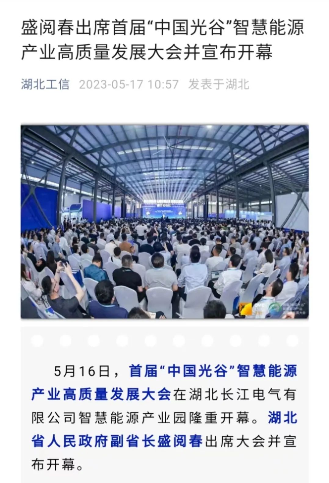 5月16日至18日,首届“中国光谷”智慧能源产业高质量发展大会成功举办,盛况空前,湖北省人民政府副省长盛阅春出席大会并宣布开幕。