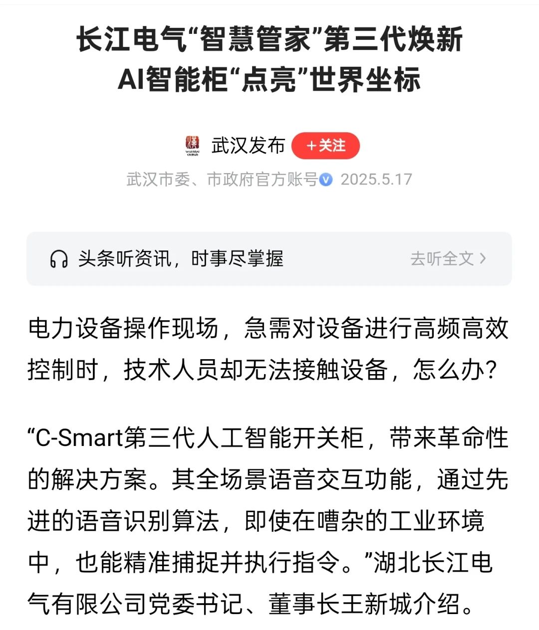 5月16日,第二十届武汉光博会及第三届“中国光谷”智慧能源产业高质量发展大会在中国光谷隆重举行,C-Smart第三代人工智能开关柜系列米兰体育官方网站 重磅发布,得到社会各界广泛关注,并获多家媒体聚焦报道。