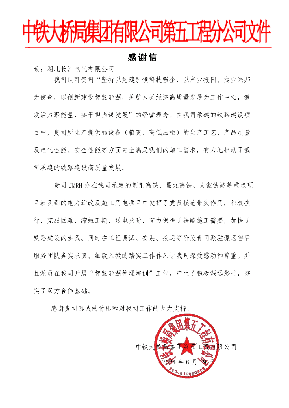 6月20日,长江电气收到来自中铁大桥局集团第五工程有限公司(以下简称为“中铁大桥局五公司”)的感谢信,感谢长江电气在该司承接相关铁路建设项目中,模范带头,务实求真,有效推动国家铁路建设的高质量发展。