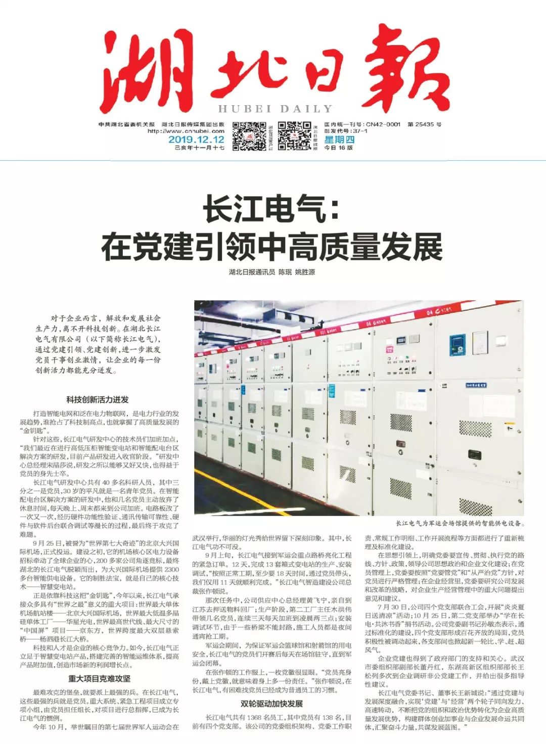 《湖北日报》报道|长江电气: 在党建引领中高质量发展